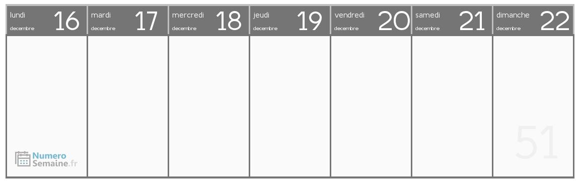 La semaine du lundi 16 décembre 2024 au dimanche 22 décembre 2024 est la numéro 51 pour l'année 2024. La 51ème semaine de l'année 2024 est numérotée selon la norme ISO-8601 ('International Organization for Standardization).
